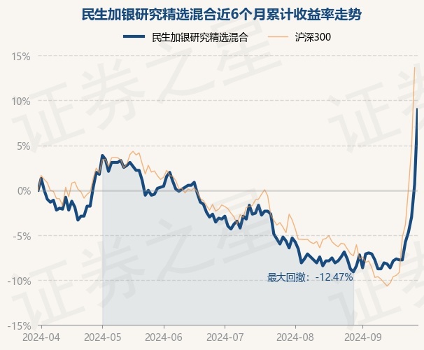 证券之星消息,9月30日,民生加银研究精选混合最新单位净值为0.984元,累计净值为1.298元,较前一交易日上涨8.25%。历史数据显示该基金近1个月上涨17.42%,近3个月上涨12.59%,近6个月上涨8.97%,近1年下跌10.46%。该基金近6个月的累计收益率走势如下图: