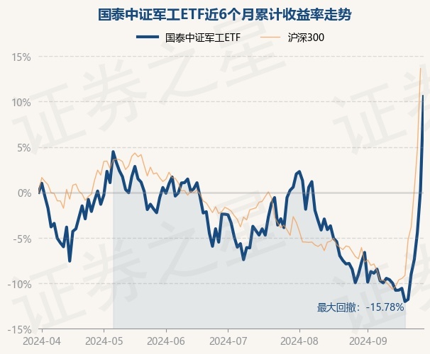 证券之星消息,9月30日,国泰中证军工ETF最新单位净值为0.9961元,累计净值为0.9961元,较前一交易日上涨10.26%。历史数据显示该基金近1个月上涨18.37%,近3个月上涨13.27%,近6个月上涨10.55%,近1年下跌0.78%。该基金近6个月的累计收益率走势如下图: