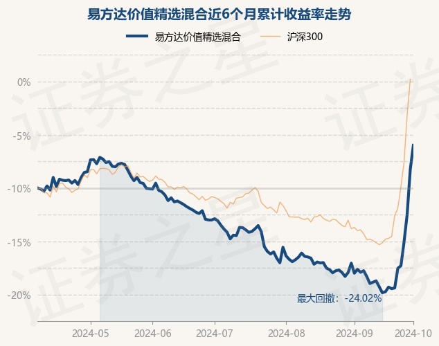 证券之星消息,10月8日,易方达价值精选混合最新单位净值为1.2452元,累计净值为3.9542元,较前一交易日上涨4.42%。历史数据显示该基金近1个月上涨29.56%,近3个月上涨19.42%,近6个月上涨8.03%,近1年上涨7.43%。该基金近6个月的累计收益率走势如下图:
