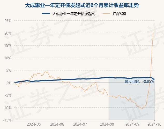 证券之星消息,10月8日,大成惠业一年定开债发起式最新单位净值为0.9999元,累计净值为1.1149元,较前一交易日下跌0.18%。历史数据显示该基金近1个月下跌0.65%,近3个月下跌0.14%,近6个月上涨1.26%,近1年上涨5.07%。该基金近6个月的累计收益率走势如下图:
