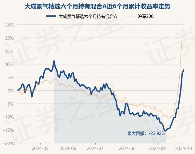 证券之星消息,10月8日,大成景气精选六个月持有混合A最新单位净值为0.8932元,累计净值为0.8932元,较前一交易日上涨1.08%。历史数据显示该基金近1个月上涨24.06%,近3个月上涨7.58%,近6个月上涨7.67%,近1年上涨10.7%。该基金近6个月的累计收益率走势如下图: