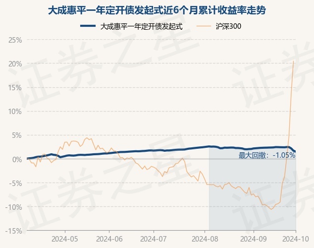 证券之星消息,10月8日,大成惠平一年定开债发起式最新单位净值为1.032元,累计净值为1.138元,较前一交易日下跌0.18%。历史数据显示该基金近1个月下跌0.78%,近3个月下跌0.17%,近6个月上涨1.48%,近1年上涨3.73%。该基金近6个月的累计收益率走势如下图: