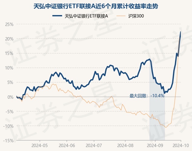 证券之星消息,10月8日,天弘中证银行ETF联接A最新单位净值为1.5796元,累计净值为1.5796元,较前一交易日上涨2.76%。历史数据显示该基金近1个月上涨16.98%,近3个月上涨15.01%,近6个月上涨22.21%,近1年上涨27.34%。该基金近6个月的累计收益率走势如下图: