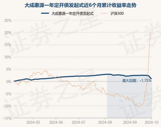 证券之星消息,10月8日,大成惠源一年定开债发起式最新单位净值为1.037元,累计净值为1.0769元,较前一交易日下跌0.23%。历史数据显示该基金近1个月下跌1.26%,近3个月下跌0.99%,近6个月上涨1.08%,近1年上涨3.97%。该基金近6个月的累计收益率走势如下图: