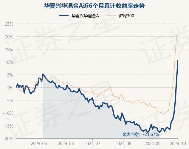 证券之星消息,10月8日,华夏兴华混合A最新单位净值为2.71元,累计净值为7.186元,较前一交易日上涨6.65%。历史数据显示该基金近1个月上涨32.84%,近3个月上涨20.5%,近6个月上涨10.39%,近1年下跌2.97%。该基金近6个月的累计收益率走势如下图: