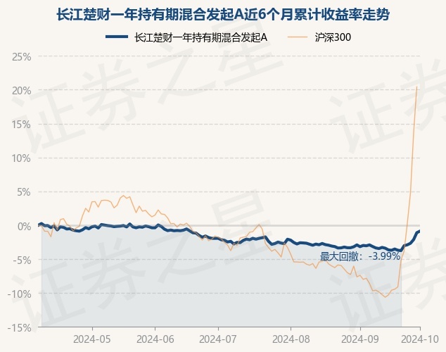 证券之星消息,10月8日,长江楚财一年持有期混合发起A最新单位净值为0.9964元,累计净值为0.9964元,较前一交易日上涨0.23%。历史数据显示该基金近1个月上涨2.34%,近3个月上涨1.94%,近6个月下跌0.88%,近1年下跌0.57%。该基金近6个月的累计收益率走势如下图: