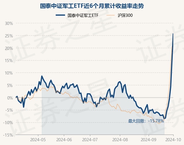 证券之星消息,10月8日,国泰中证军工ETF最新单位净值为1.0882元,累计净值为1.0882元,较前一交易日上涨9.25%。历史数据显示该基金近1个月上涨33.78%,近3个月上涨30.43%,近6个月上涨25.54%,近1年上涨8.4%。该基金近6个月的累计收益率走势如下图: