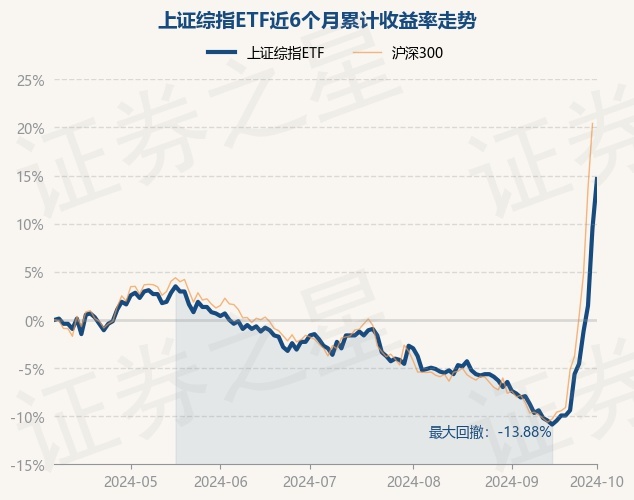 证券之星消息,10月8日,上证综指ETF最新单位净值为0.854元,累计净值为1.761元,较前一交易日上涨4.66%。历史数据显示该基金近1个月上涨25.59%,近3个月上涨18.94%,近6个月上涨14.63%,近1年上涨11.36%。该基金近6个月的累计收益率走势如下图: