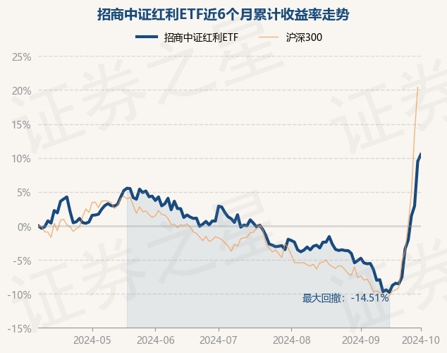 证券之星消息,10月8日,招商中证红利ETF最新单位净值为1.6307元,累计净值为1.9307元,较前一交易日上涨0.92%。历史数据显示该基金近1个月上涨18.11%,近3个月上涨9.96%,近6个月上涨10.48%,近1年上涨15.6%。该基金近6个月的累计收益率走势如下图: