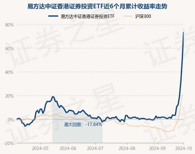 证券之星消息,10月8日,易方达中证香港证券投资ETF最新单位净值为1.5429元,累计净值为1.5429元,较前一交易日上涨15.88%。历史数据显示该基金近1个月上涨70.17%,近3个月上涨76.98%,近6个月上涨73.13%,近1年上涨42.02%。该基金近6个月的累计收益率走势如下图: