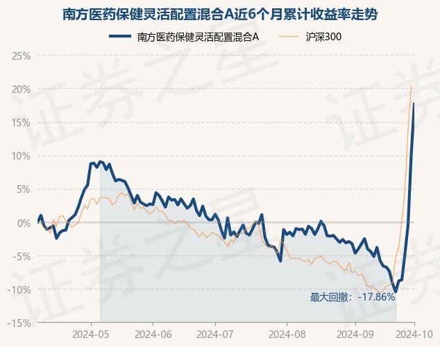 证券之星消息,10月8日,南方医药保健灵活配置混合A最新单位净值为2.3505元,累计净值为2.5655元,较前一交易日上涨6.97%。历史数据显示该基金近1个月上涨22.59%,近3个月上涨19.98%,近6个月上涨17.64%,近1年上涨7.57%。该基金近6个月的累计收益率走势如下图: