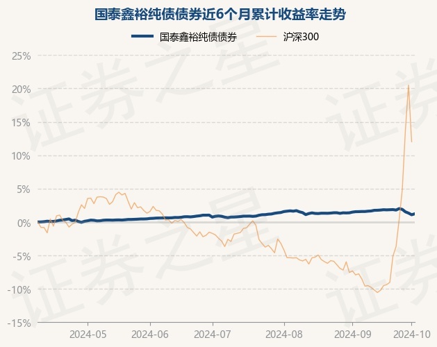 证券之星消息,10月9日,国泰鑫裕纯债债券最新单位净值为1.0245元,累计净值为1.0661元,较前一交易日上涨0.14%。历史数据显示该基金近1个月下跌0.39%,近3个月上涨0.49%,近6个月上涨1.23%,近1年上涨4.12%。该基金近6个月的累计收益率走势如下图: