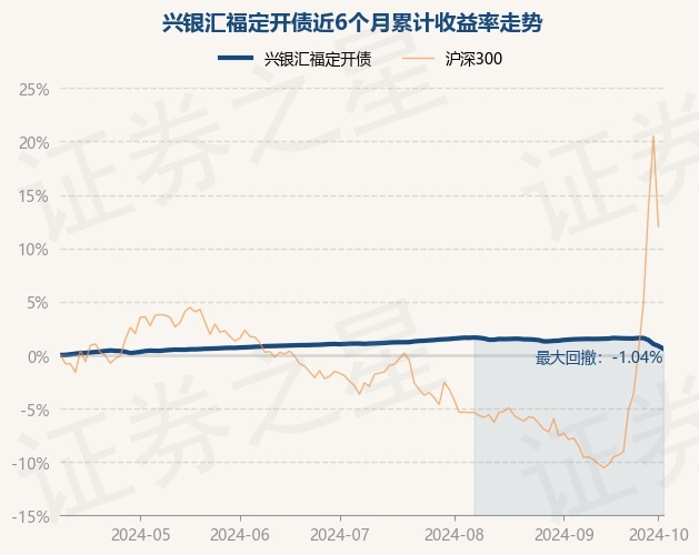 证券之星消息,10月9日,兴银汇福定开债最新单位净值为1.0174元,累计净值为1.1974元,较前一交易日下跌0.26%。历史数据显示该基金近1个月下跌0.92%,近3个月下跌0.48%,近6个月上涨0.59%,近1年上涨2.87%。该基金近6个月的累计收益率走势如下图: