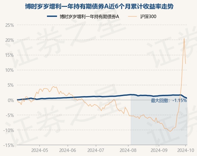 证券之星消息,10月9日,博时岁岁增利一年持有期债券A最新单位净值为1.2174元,累计净值为1.7246元,较前一交易日下跌0.19%。历史数据显示该基金近1个月下跌0.89%,近3个月下跌0.49%,近6个月上涨0.56%,近1年上涨3.2%。该基金近6个月的累计收益率走势如下图: