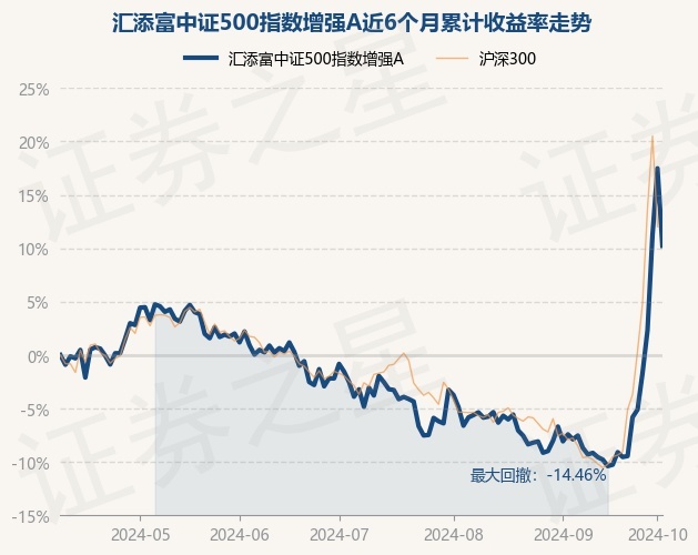 证券之星消息,10月9日,汇添富中证500指数增强A最新单位净值为1.6062元,累计净值为1.8712元,较前一交易日下跌6.17%。历史数据显示该基金近1个月上涨21.53%,近3个月上涨13.71%,近6个月上涨10.23%,近1年上涨8.1%。该基金近6个月的累计收益率走势如下图: