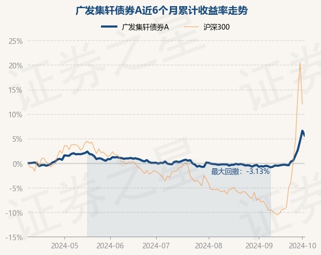 证券之星消息,10月9日,广发集轩债券A最新单位净值为1.0538元,累计净值为1.0538元,较前一交易日下跌0.92%。历史数据显示该基金近1个月上涨6.52%,近3个月上涨5.82%,近6个月上涨5.62%,近1年上涨6.1%。该基金近6个月的累计收益率走势如下图: