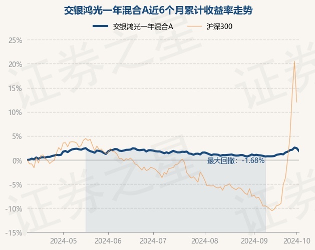 证券之星消息,10月9日,交银鸿光一年混合A最新单位净值为1.0216元,累计净值为1.0216元,较前一交易日下跌0.55%。历史数据显示该基金近1个月上涨1.14%,近3个月上涨0.28%,近6个月上涨1.87%,近1年上涨1.78%。该基金近6个月的累计收益率走势如下图: