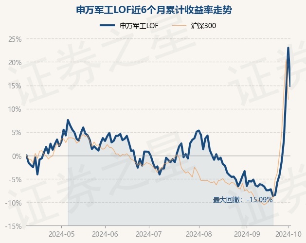 证券之星消息,10月9日,申万军工LOF最新单位净值为0.9868元,累计净值为1.8055元,较前一交易日下跌6.64%。历史数据显示该基金近1个月上涨23.03%,近3个月上涨18.14%,近6个月上涨14.86%,近1年下跌0.32%。该基金近6个月的累计收益率走势如下图: