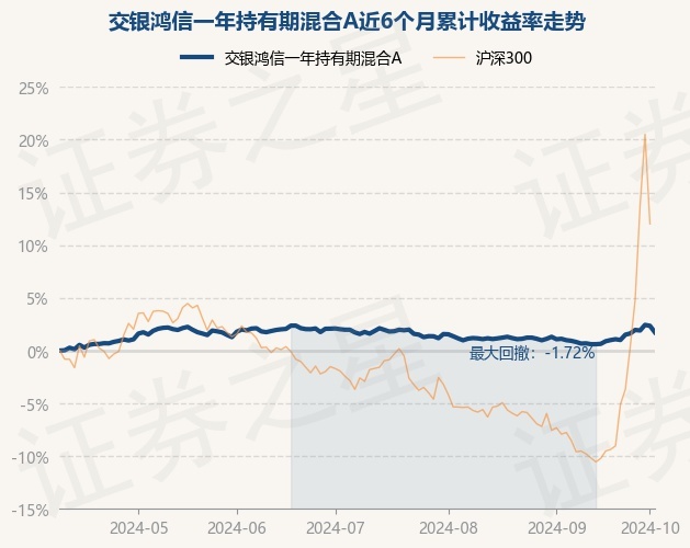 证券之星消息,10月9日,交银鸿信一年持有期混合A最新单位净值为1.0181元,累计净值为1.0181元,较前一交易日下跌0.6%。历史数据显示该基金近1个月上涨1.06%,近3个月下跌0.03%,近6个月上涨1.74%,近1年上涨2.34%。该基金近6个月的累计收益率走势如下图: