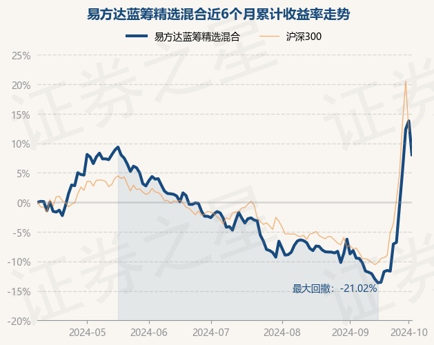 证券之星消息,10月9日,易方达蓝筹精选混合最新单位净值为1.8578元,累计净值为1.8578元,较前一交易日下跌5.04%。历史数据显示该基金近1个月上涨22.31%,近3个月上涨12.7%,近6个月上涨8.05%,近1年下跌5.03%。该基金近6个月的累计收益率走势如下图: