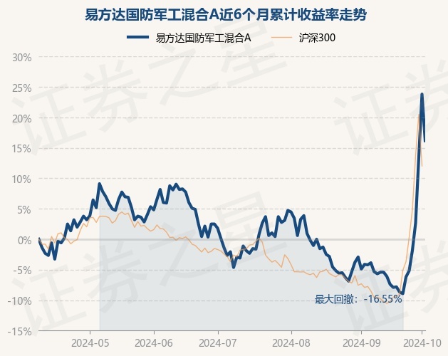 证券之星消息,10月9日,易方达国防军工混合A最新单位净值为1.351元,累计净值为1.351元,较前一交易日下跌6.18%。历史数据显示该基金近1个月上涨23.15%,近3个月上涨19.66%,近6个月上涨16.17%,近1年下跌6.83%。该基金近6个月的累计收益率走势如下图: