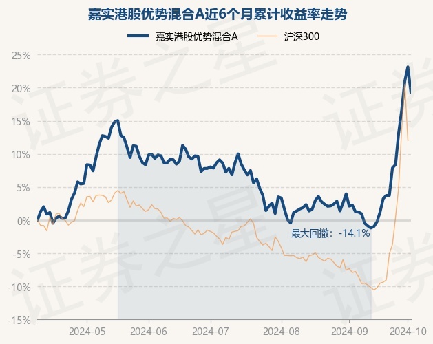 证券之星消息,10月9日,嘉实港股优势混合A最新单位净值为0.9007元,累计净值为0.9007元,较前一交易日下跌3.14%。历史数据显示该基金近1个月上涨19.82%,近3个月上涨10.62%,近6个月上涨19.27%,近1年上涨21.21%。该基金近6个月的累计收益率走势如下图: