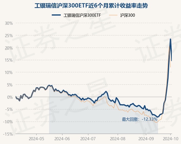 证券之星消息,10月9日,工银瑞信沪深300ETF最新单位净值为3.986元,累计净值为1.1334元,较前一交易日下跌7.03%。历史数据显示该基金近1个月上涨23.58%,近3个月上涨16.14%,近6个月上涨14.58%,近1年上涨10.18%。该基金近6个月的累计收益率走势如下图: