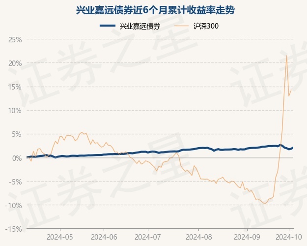证券之星消息,10月10日,兴业嘉远债券最新单位净值为1.0209元,累计净值为1.0469元,较前一交易日上涨0.26%。历史数据显示该基金近1个月下跌0.06%,近3个月上涨0.98%,近6个月上涨2.07%,近1年上涨4.57%。该基金近6个月的累计收益率走势如下图: