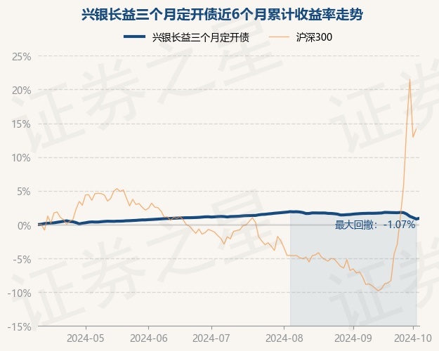 证券之星消息,10月10日,兴银长益三个月定开债最新单位净值为1.0083元,累计净值为1.3142元,较前一交易日上涨0.1%。历史数据显示该基金近1个月下跌0.73%,近3个月下跌0.27%,近6个月上涨0.92%,近1年上涨3.4%。该基金近6个月的累计收益率走势如下图: