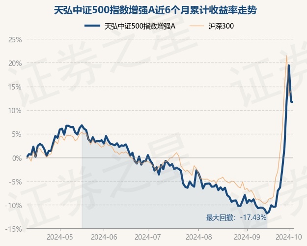 证券之星消息,10月10日,天弘中证500指数增强A最新单位净值为1.1609元,累计净值为1.1609元,较前一交易日下跌0.09%。历史数据显示该基金近1个月上涨24.91%,近3个月上涨14.53%,近6个月上涨11.67%,近1年上涨5.13%。该基金近6个月的累计收益率走势如下图: