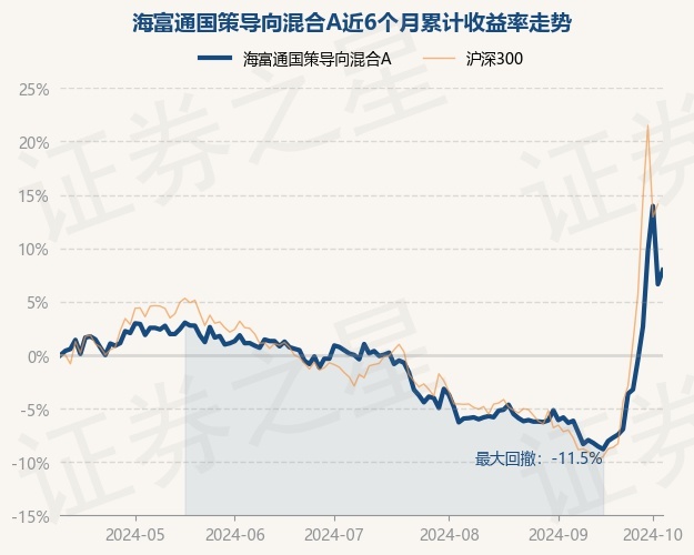 证券之星消息,10月10日,海富通国策导向混合A最新单位净值为1.8816元,累计净值为2.9207元,较前一交易日上涨1.25%。历史数据显示该基金近1个月上涨17.29%,近3个月上涨7.8%,近6个月上涨7.96%,近1年上涨7.94%。该基金近6个月的累计收益率走势如下图: