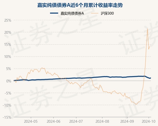 证券之星消息,10月10日,嘉实纯债债券A最新单位净值为1.3347元,累计净值为1.5223元,较前一交易日上涨0.15%。历史数据显示该基金近1个月下跌0.55%,近3个月上涨0.04%,近6个月上涨1.11%,近1年上涨3.72%。该基金近6个月的累计收益率走势如下图: