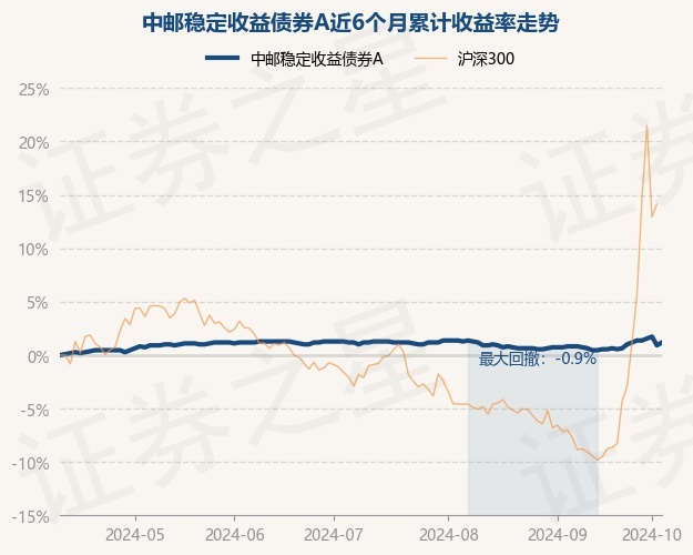 证券之星消息,10月10日,中邮稳定收益债券A最新单位净值为1.111元,累计净值为1.659元,较前一交易日上涨0.27%。历史数据显示该基金近1个月上涨0.54%,近3个月上涨0.0%,近6个月上涨1.18%,近1年上涨4.01%。该基金近6个月的累计收益率走势如下图: