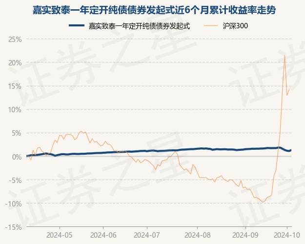 证券之星消息,10月10日,嘉实致泰一年定开纯债债券发起式最新单位净值为1.0241元,累计净值为1.0637元,较前一交易日上涨0.2%。历史数据显示该基金近1个月下跌0.29%,近3个月上涨0.17%,近6个月上涨1.28%,近1年上涨3.74%。该基金近6个月的累计收益率走势如下图: