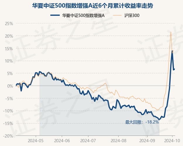证券之星消息,10月10日,华夏中证500指数增强A最新单位净值为1.8051元,累计净值为1.8051元,较前一交易日上涨0.29%。历史数据显示该基金近1个月上涨21.61%,近3个月上涨13.02%,近6个月上涨6.63%,近1年上涨5.51%。该基金近6个月的累计收益率走势如下图:
