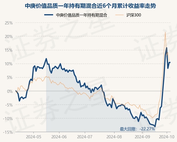 证券之星消息,10月11日,中庚价值品质一年持有期混合最新单位净值为1.5136元,累计净值为1.5136元,较前一交易日上涨0.0%。历史数据显示该基金近1个月上涨23.35%,近3个月上涨6.85%,近6个月上涨8.2%,近1年上涨3.57%。该基金近6个月的累计收益率走势如下图: