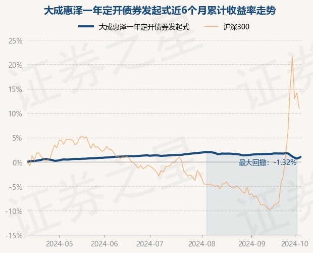 证券之星消息,10月11日,大成惠泽一年定开债券发起式最新单位净值为1.0206元,累计净值为1.1148元,较前一交易日上涨0.19%。历史数据显示该基金近1个月下跌0.57%,近3个月下跌0.26%,近6个月上涨1.05%,近1年上涨4.02%。该基金近6个月的累计收益率走势如下图: