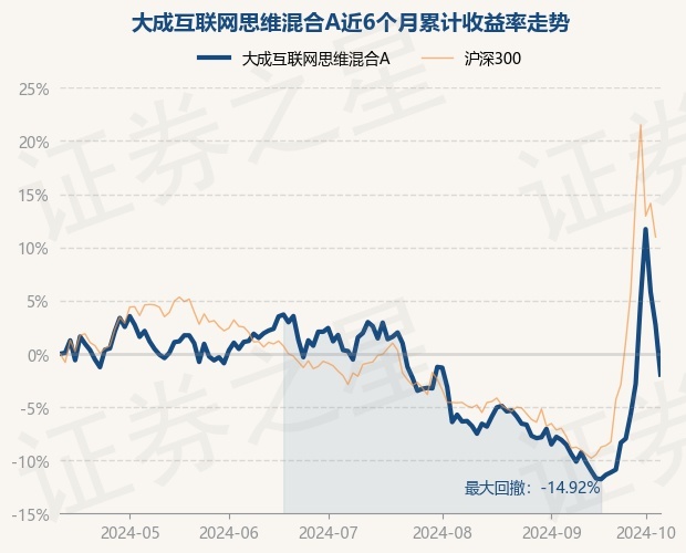 证券之星消息,10月11日,大成互联网思维混合A最新单位净值为1.4689元,累计净值为1.4689元,较前一交易日下跌4.53%。历史数据显示该基金近1个月上涨9.19%,近3个月下跌4.78%,近6个月下跌1.95%,近1年下跌7.21%。该基金近6个月的累计收益率走势如下图: