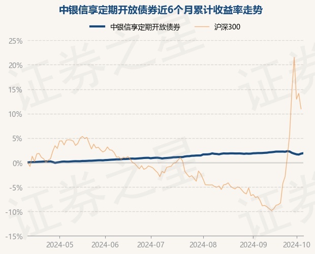 证券之星消息,10月11日,中银信享定期开放债券最新单位净值为1.0193元,累计净值为1.2782元,较前一交易日上涨0.1%。历史数据显示该基金近1个月下跌0.17%,近3个月上涨0.94%,近6个月上涨1.91%,近1年上涨3.79%。该基金近6个月的累计收益率走势如下图: