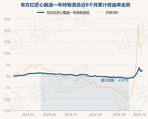 证券之星消息,10月11日,东方红匠心甄选一年持有混合最新单位净值为1.0194元,累计净值为1.152元,较前一交易日下跌0.37%。历史数据显示该基金近1个月上涨2.97%,近3个月上涨1.51%,近6个月上涨2.1%,近1年上涨2.97%。该基金近6个月的累计收益率走势如下图: