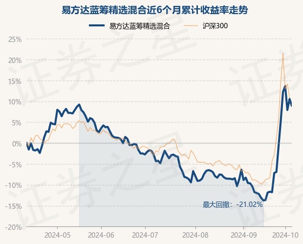 证券之星消息,10月11日,易方达蓝筹精选混合最新单位净值为1.8761元,累计净值为1.8761元,较前一交易日下跌1.43%。历史数据显示该基金近1个月上涨24.13%,近3个月上涨12.65%,近6个月上涨8.98%,近1年下跌4.88%。该基金近6个月的累计收益率走势如下图:
