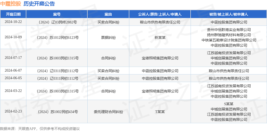 根据统计,近一年内以中霆控股集团有限公司为当事人的历史开庭公告有7则,其中案由为“买卖合同纠纷”的公告以3则居首,其次为“合同纠纷”有2则,“委托理财合同纠纷”有1则。历史开庭公告如下: