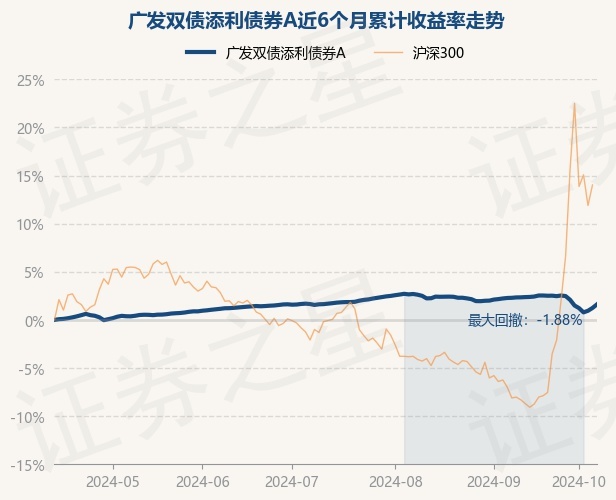 证券之星消息,10月14日,广发双债添利债券A最新单位净值为1.2241元,累计净值为1.6369元,较前一交易日上涨0.37%。历史数据显示该基金近1个月下跌0.79%,近3个月下跌0.12%,近6个月上涨1.61%,近1年上涨5.45%。该基金近6个月的累计收益率走势如下图: