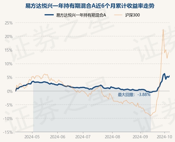 证券之星消息,10月14日,易方达悦兴一年持有期混合A最新单位净值为1.0323元,累计净值为1.0323元,较前一交易日上涨0.43%。历史数据显示该基金近1个月上涨5.93%,近3个月上涨4.04%,近6个月上涨5.43%,近1年上涨2.7%。该基金近6个月的累计收益率走势如下图:
