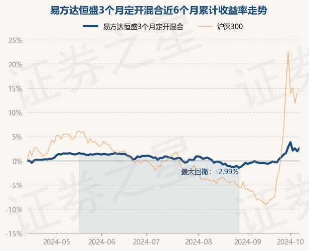 证券之星消息,10月14日,易方达恒盛3个月定开混合最新单位净值为1.1272元,累计净值为1.3152元,较前一交易日上涨0.65%。历史数据显示该基金近1个月上涨3.24%,近3个月上涨1.73%,近6个月上涨2.58%,近1年上涨6.76%。该基金近6个月的累计收益率走势如下图: