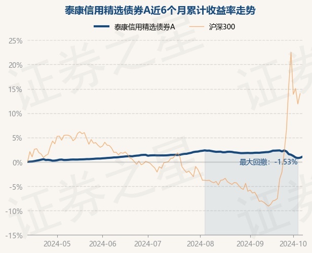 证券之星消息,10月14日,泰康信用精选债券A最新单位净值为1.127元,累计净值为1.1921元,较前一交易日上涨0.2%。历史数据显示该基金近1个月下跌1.05%,近3个月下跌0.32%,近6个月上涨1.05%,近1年上涨3.78%。该基金近6个月的累计收益率走势如下图: