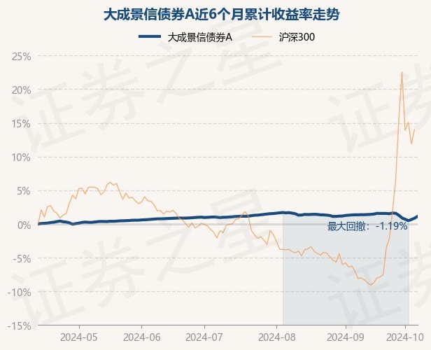 证券之星消息,10月14日,大成景信债券A最新单位净值为1.0381元,累计净值为1.0381元,较前一交易日上涨0.27%。历史数据显示该基金近1个月下跌0.33%,近3个月上涨0.07%,近6个月上涨1.13%,近1年上涨3.87%。该基金近6个月的累计收益率走势如下图: