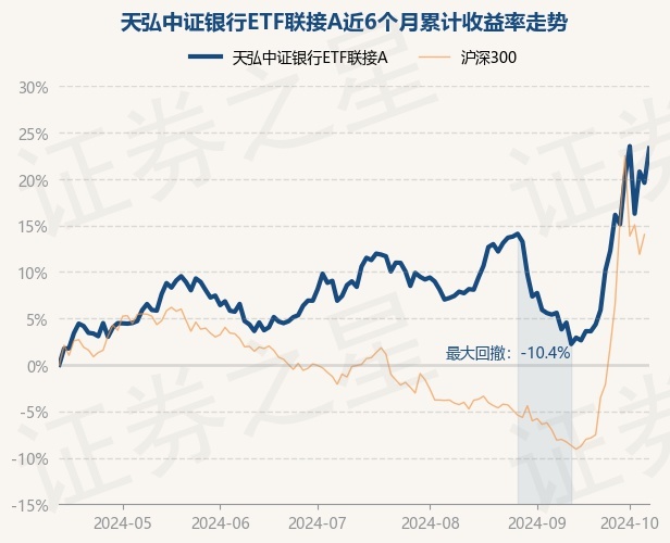 证券之星消息,10月14日,天弘中证银行ETF联接A最新单位净值为1.5767元,累计净值为1.5767元,较前一交易日上涨3.11%。历史数据显示该基金近1个月上涨20.14%,近3个月上涨11.5%,近6个月上涨23.3%,近1年上涨26.69%。该基金近6个月的累计收益率走势如下图: