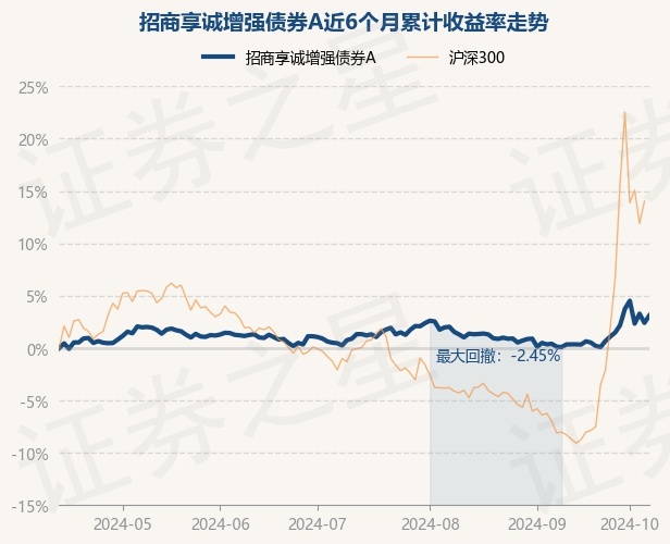 证券之星消息,10月14日,招商享诚增强债券A最新单位净值为1.11元,累计净值为1.11元,较前一交易日上涨0.68%。历史数据显示该基金近1个月上涨2.76%,近3个月上涨1.75%,近6个月上涨3.1%,近1年上涨7.02%。该基金近6个月的累计收益率走势如下图: