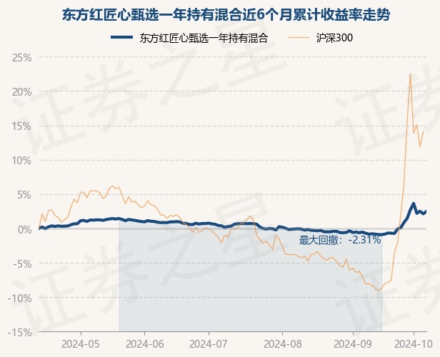 证券之星消息,10月14日,东方红匠心甄选一年持有混合最新单位净值为1.0229元,累计净值为1.1555元,较前一交易日上涨0.34%。历史数据显示该基金近1个月上涨3.41%,近3个月上涨1.77%,近6个月上涨2.47%,近1年上涨3.37%。该基金近6个月的累计收益率走势如下图: